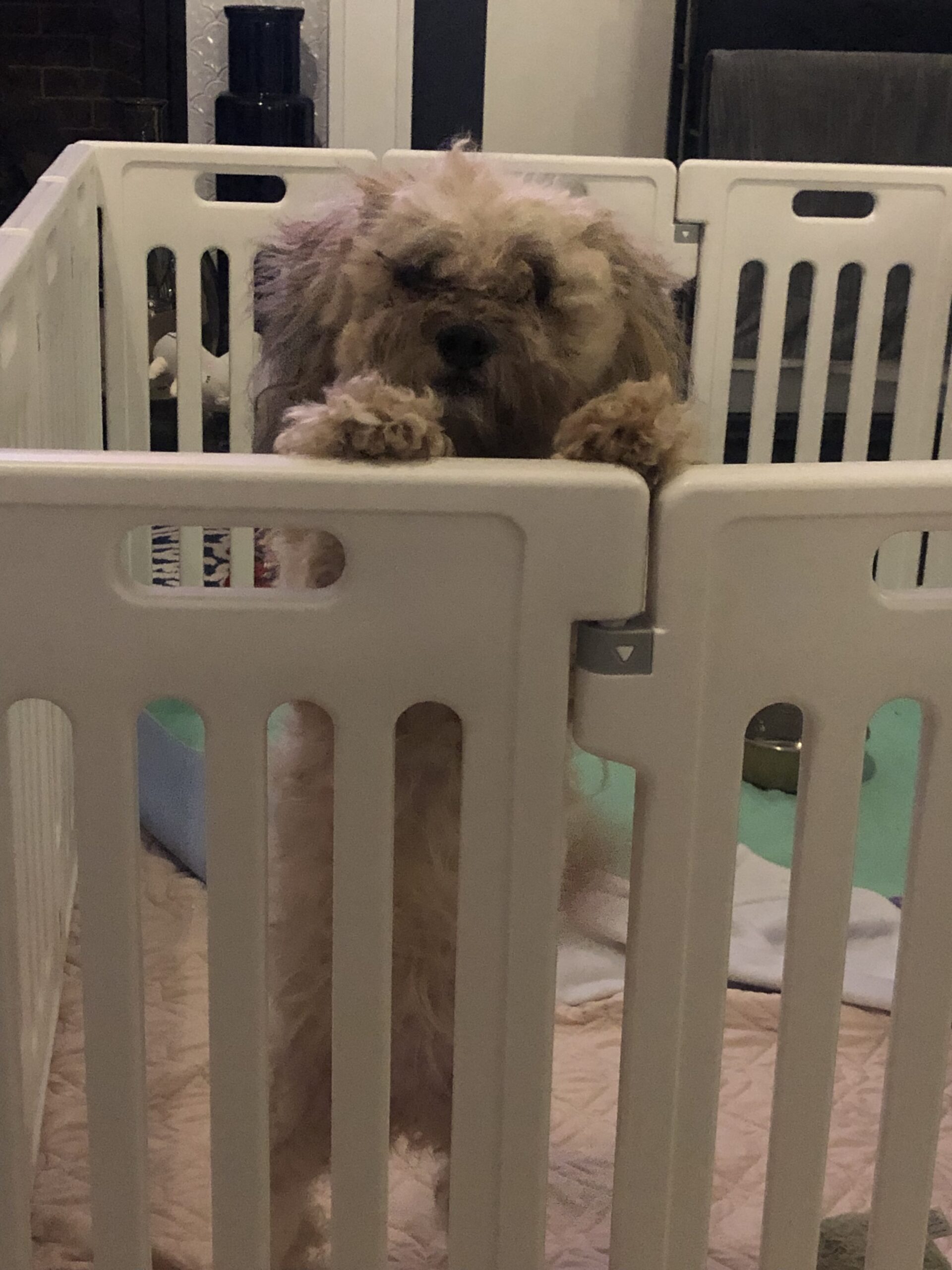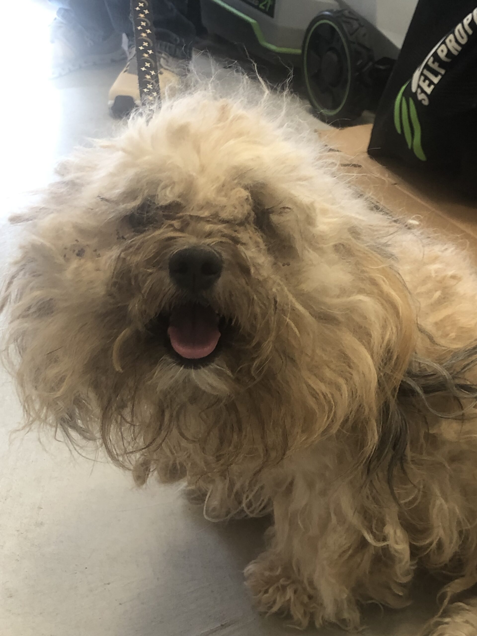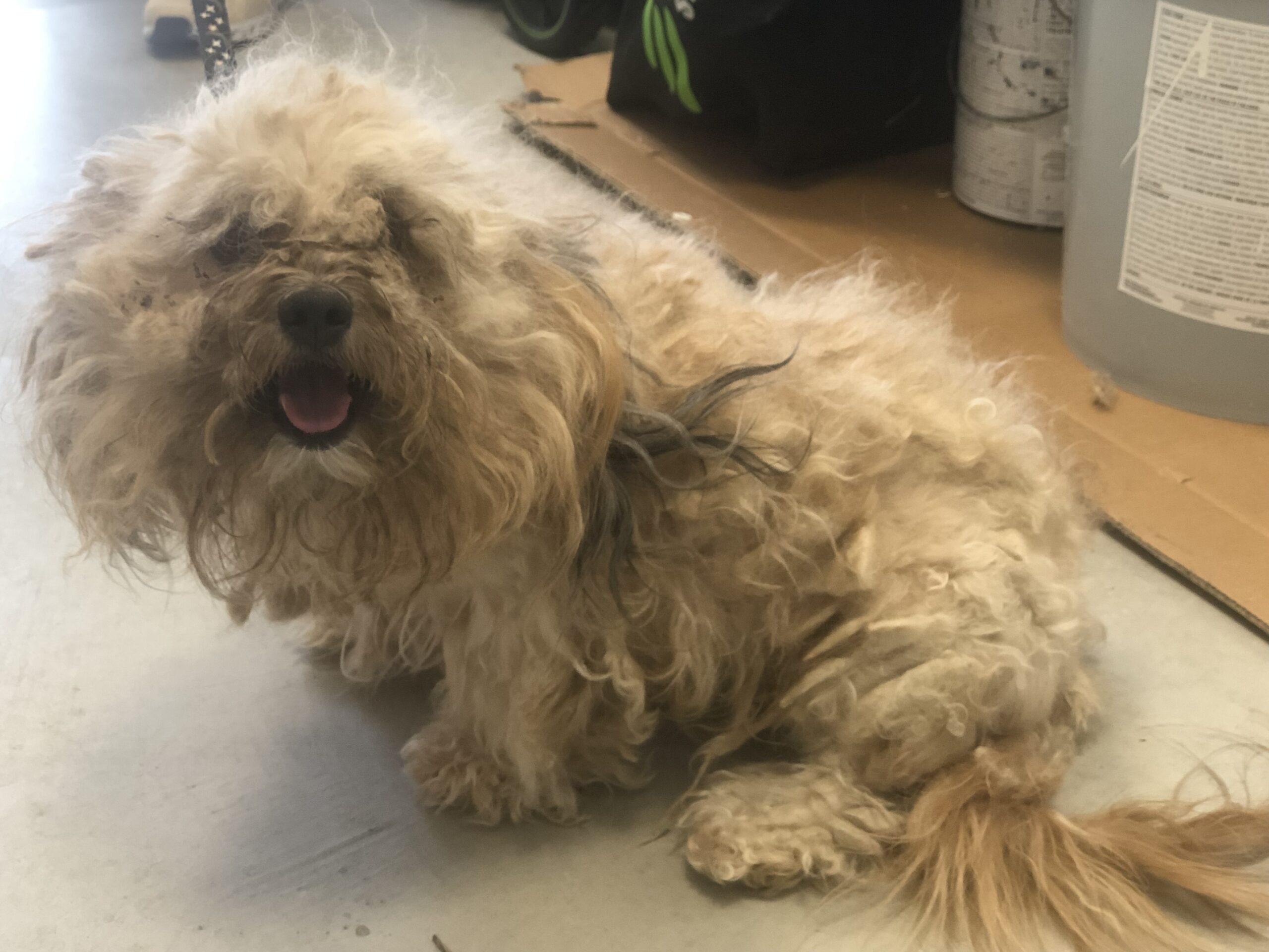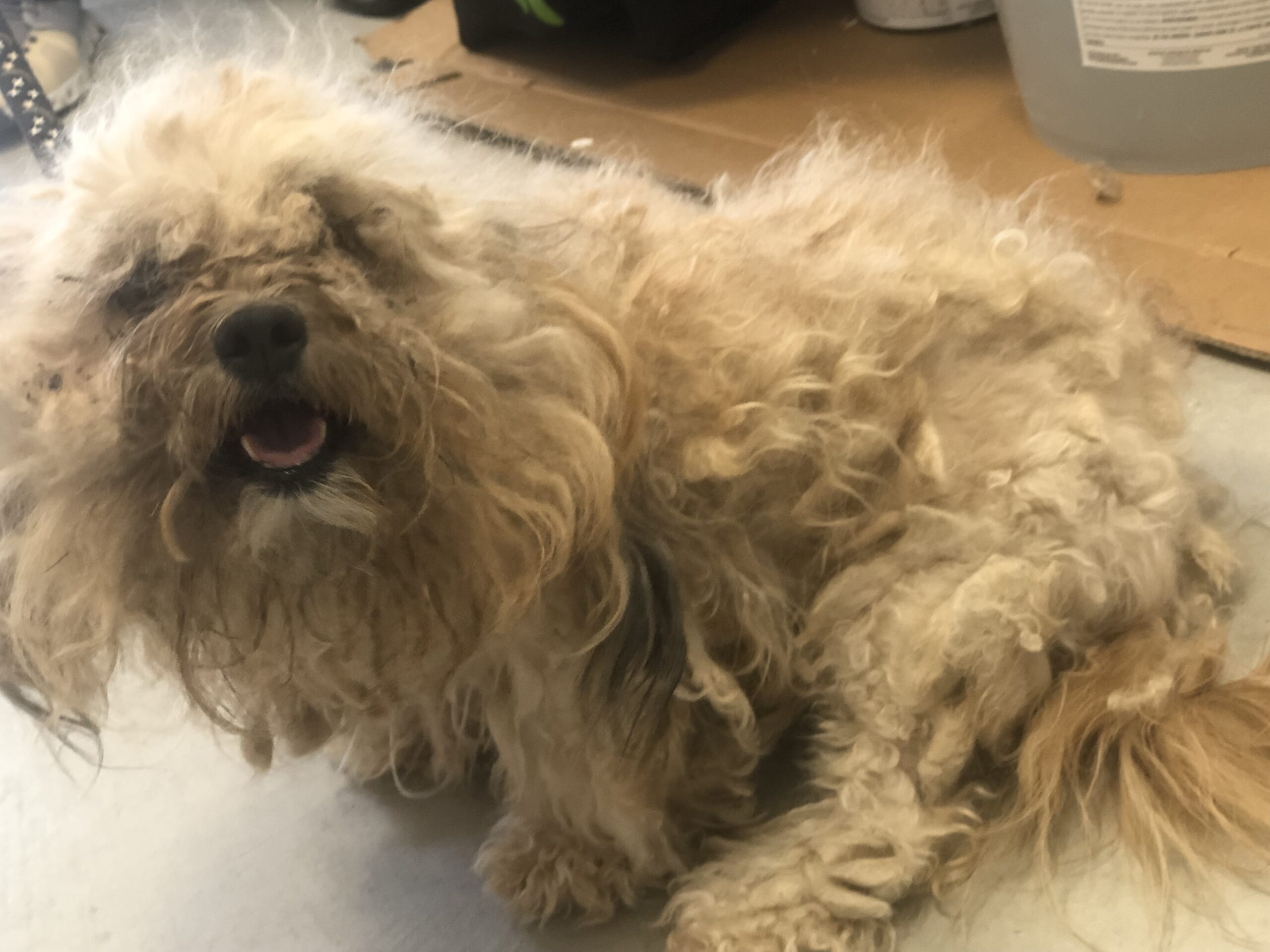 She has not been groomed for some time. Her coat is so matted and in horrible shape. She desperately needs to be groomed. She dad allow for foster mom to cut off all the mats and give her a did allow for foster mom to cut off all the mats and give her an bath.
