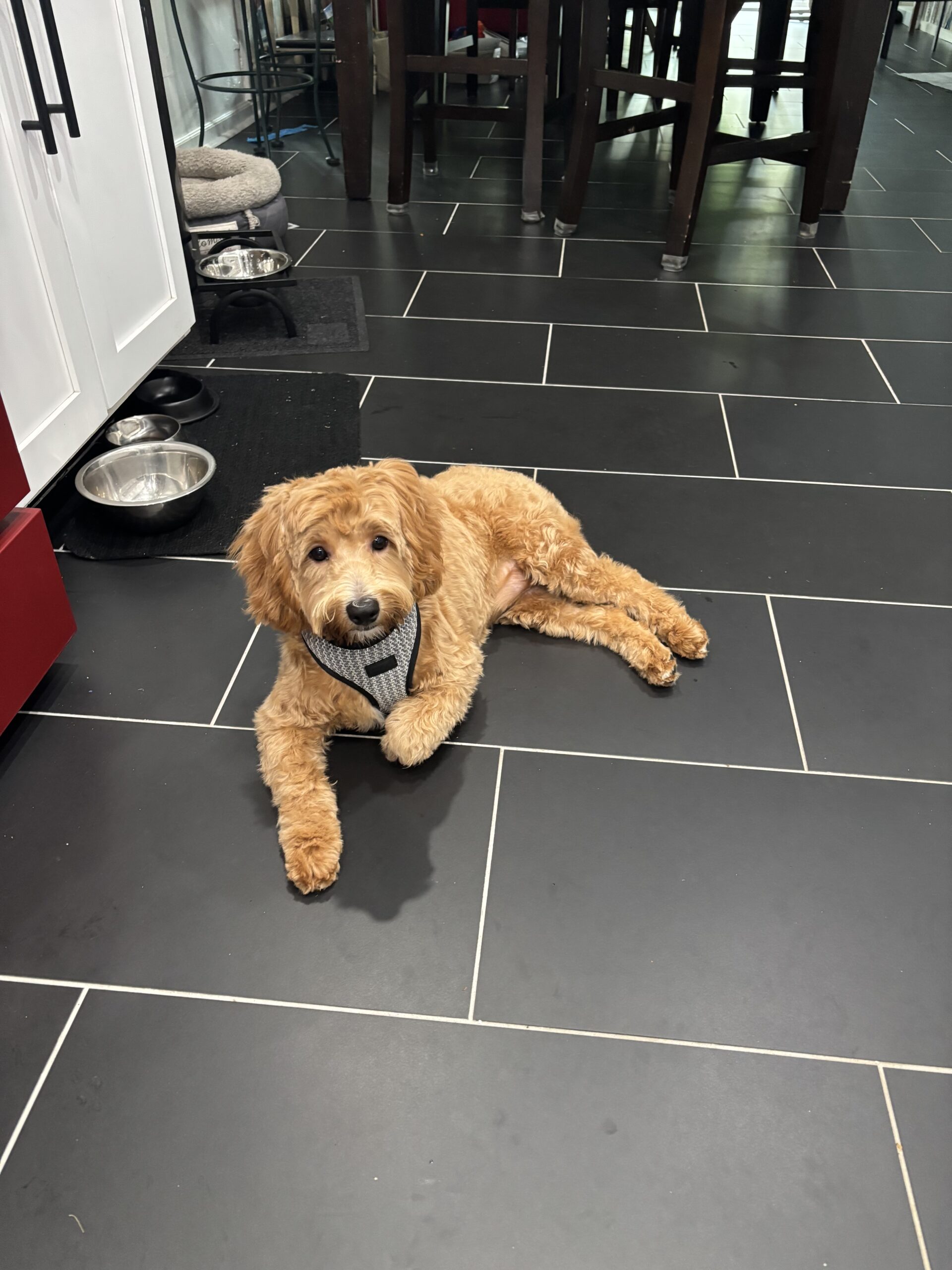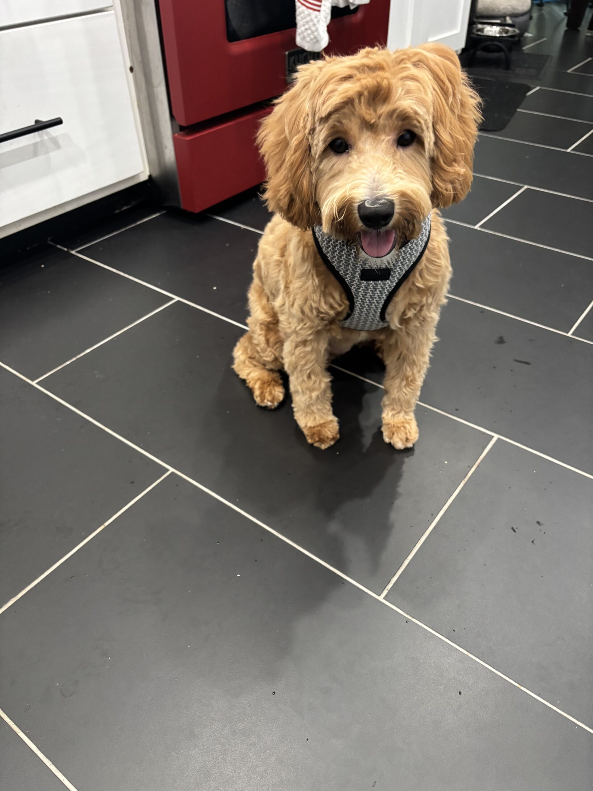 Goldie is full of puppy energy! She likes to play for hours with her foster brother who is of similar size. She seems to be house trained (rings a bell) and walks well on leash.