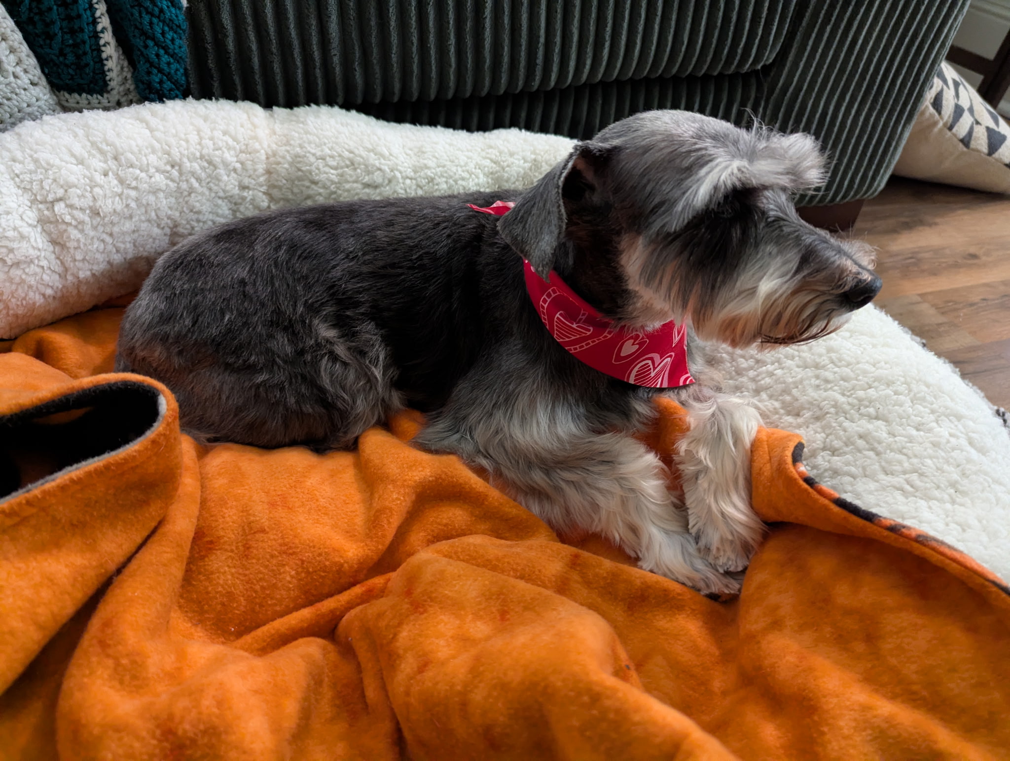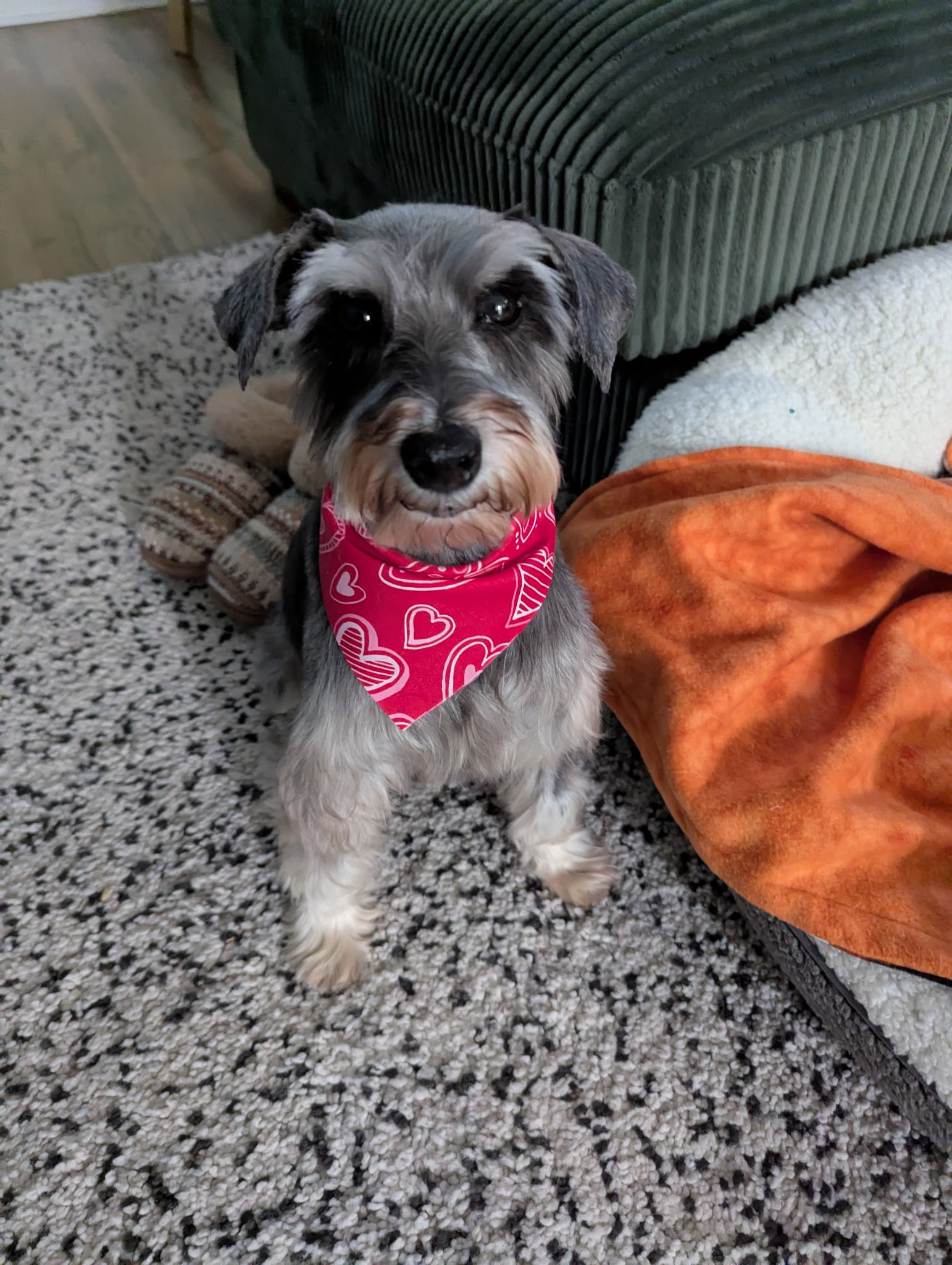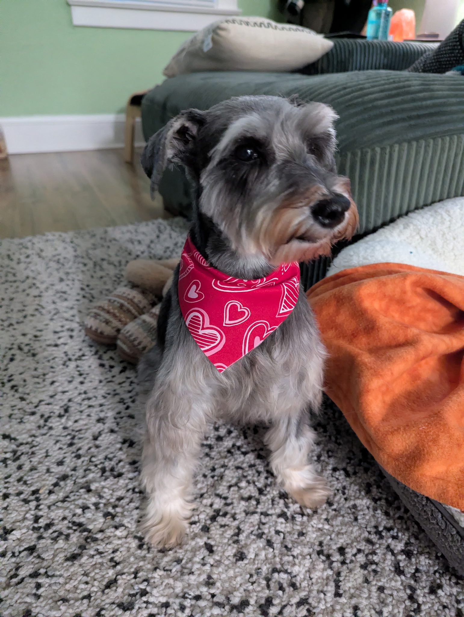 Sweet June Bug the Miniature Schnauzer comes to us from a Pennsylvania puppy mill. She is 6.5 years old and weighs 16 pounds.